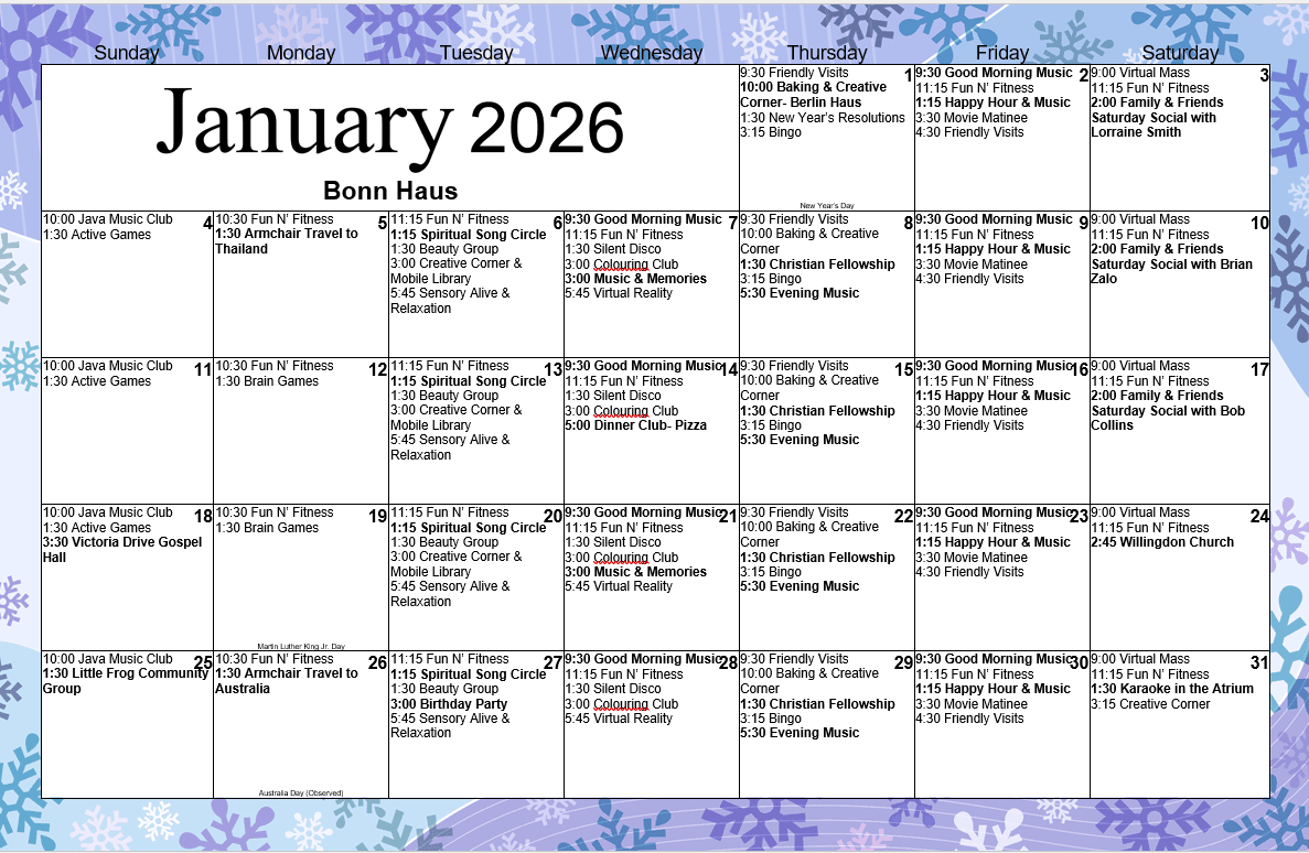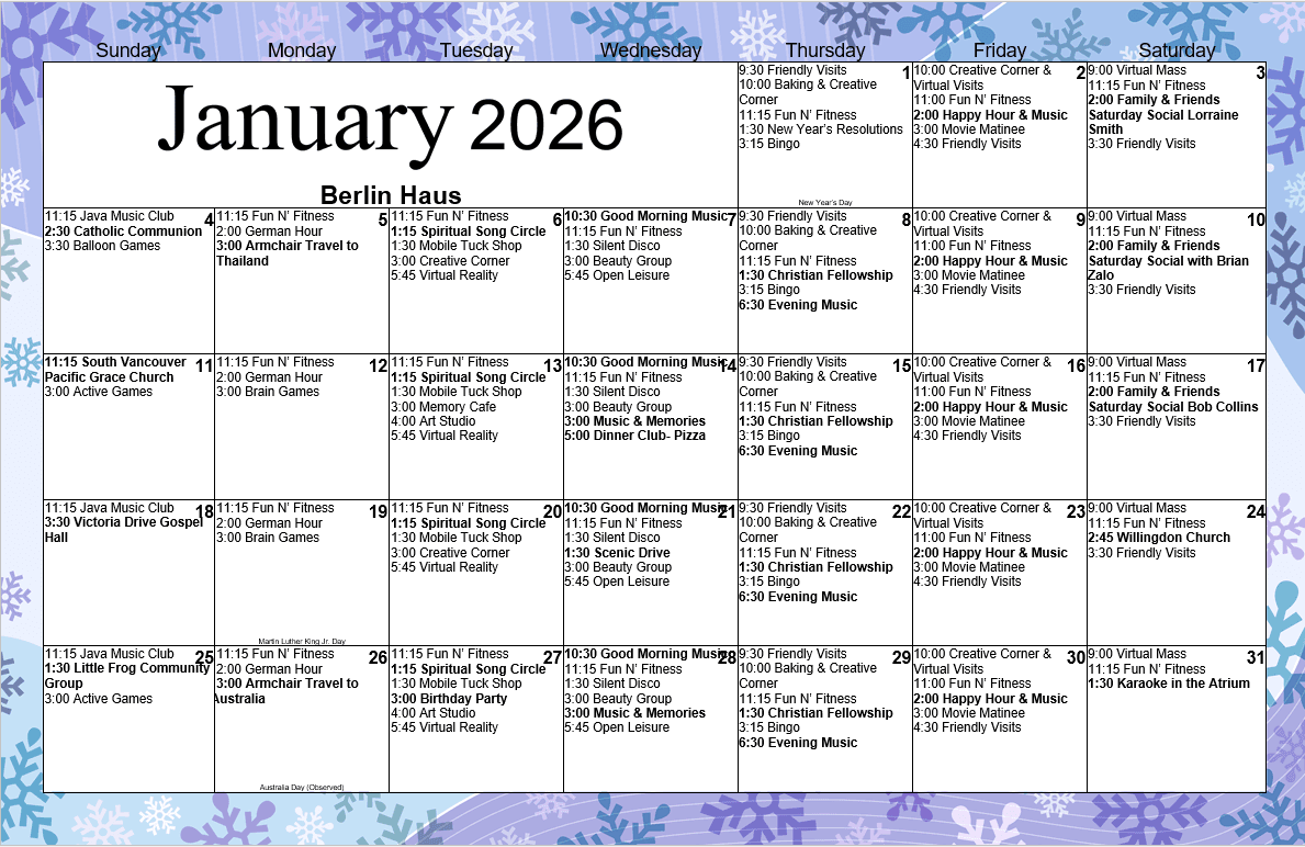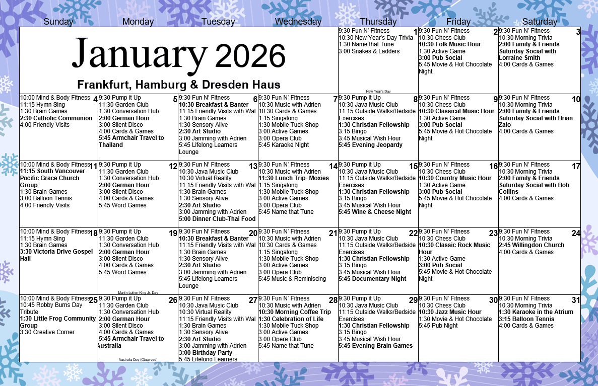 Monthly Recreation CalendarJanuary 2026: Frankfurt Hamburg Dresden January 2026: Bonn Haus January 2026: Berlin Haus